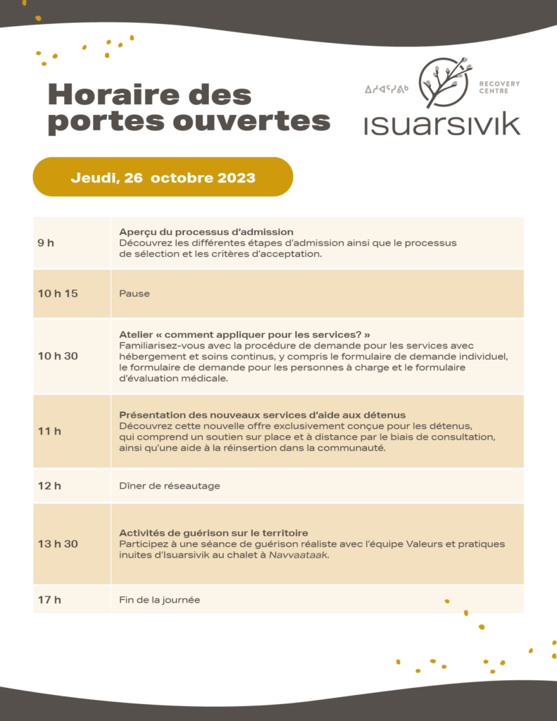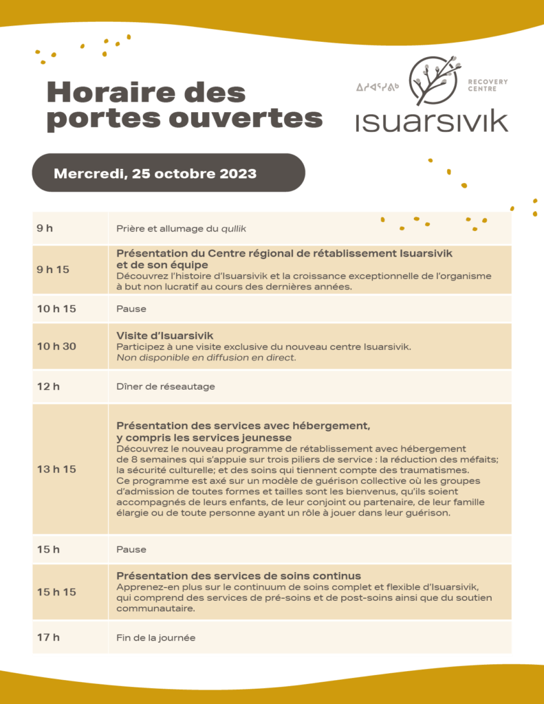L’ensemble des travailleur(e)s de première ligne et autres professionel(le)s sont invité(e)s à participer à une séance de deux jours qui portera sur les programmes et les services d’Isuarsivik.